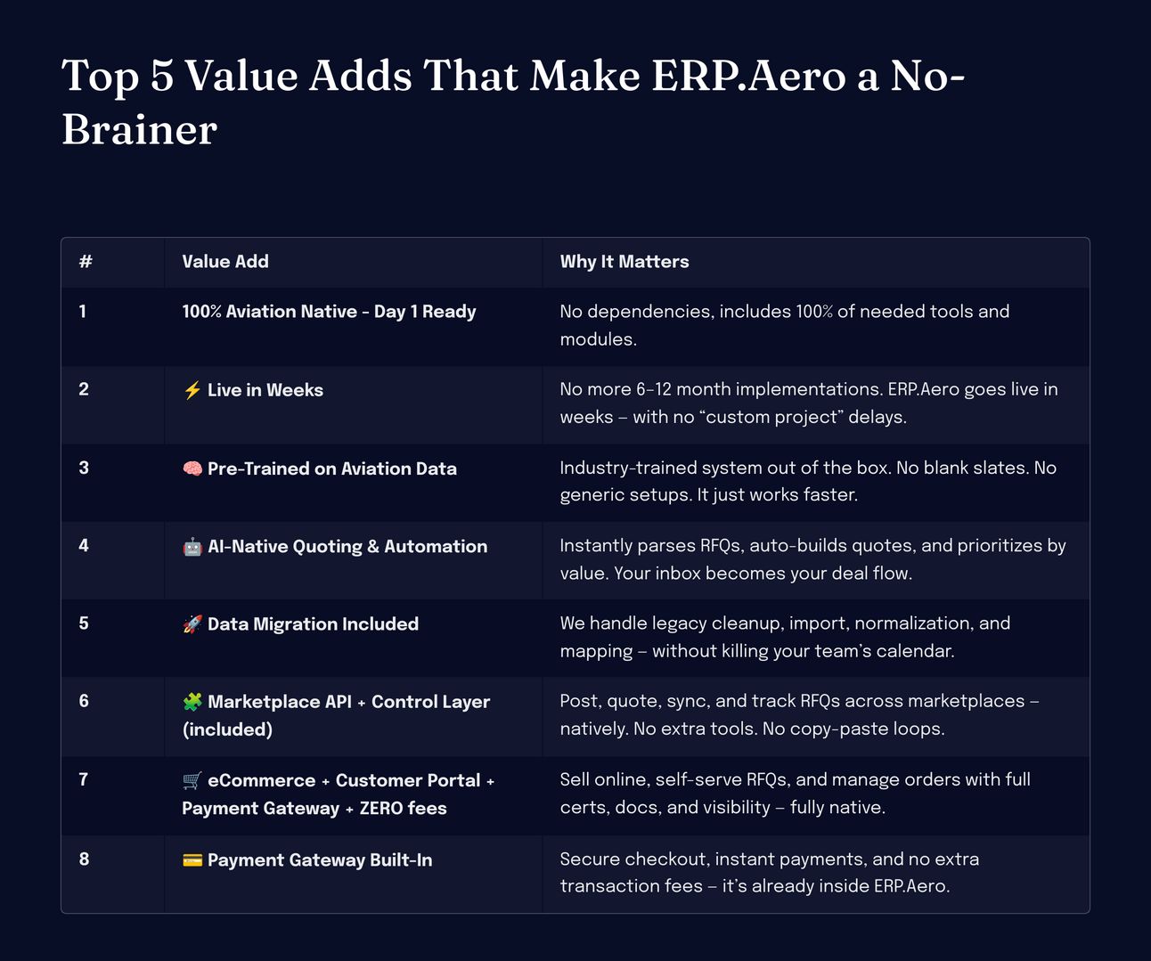 ERP.Aero consolidates everything into one native, aviation-ready stack — and you go live in weeks.